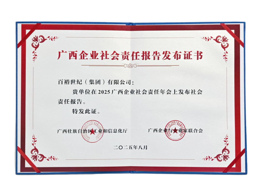 8月27日,由自治區(qū)工業(yè)和信息化廳、廣西企業(yè)與企業(yè)家聯(lián)合會共同主辦的2025廣西企業(yè)社會責(zé)任年會在南寧隆重舉行。會上發(fā)布了百裕集團2024年度社會責(zé)任報告。